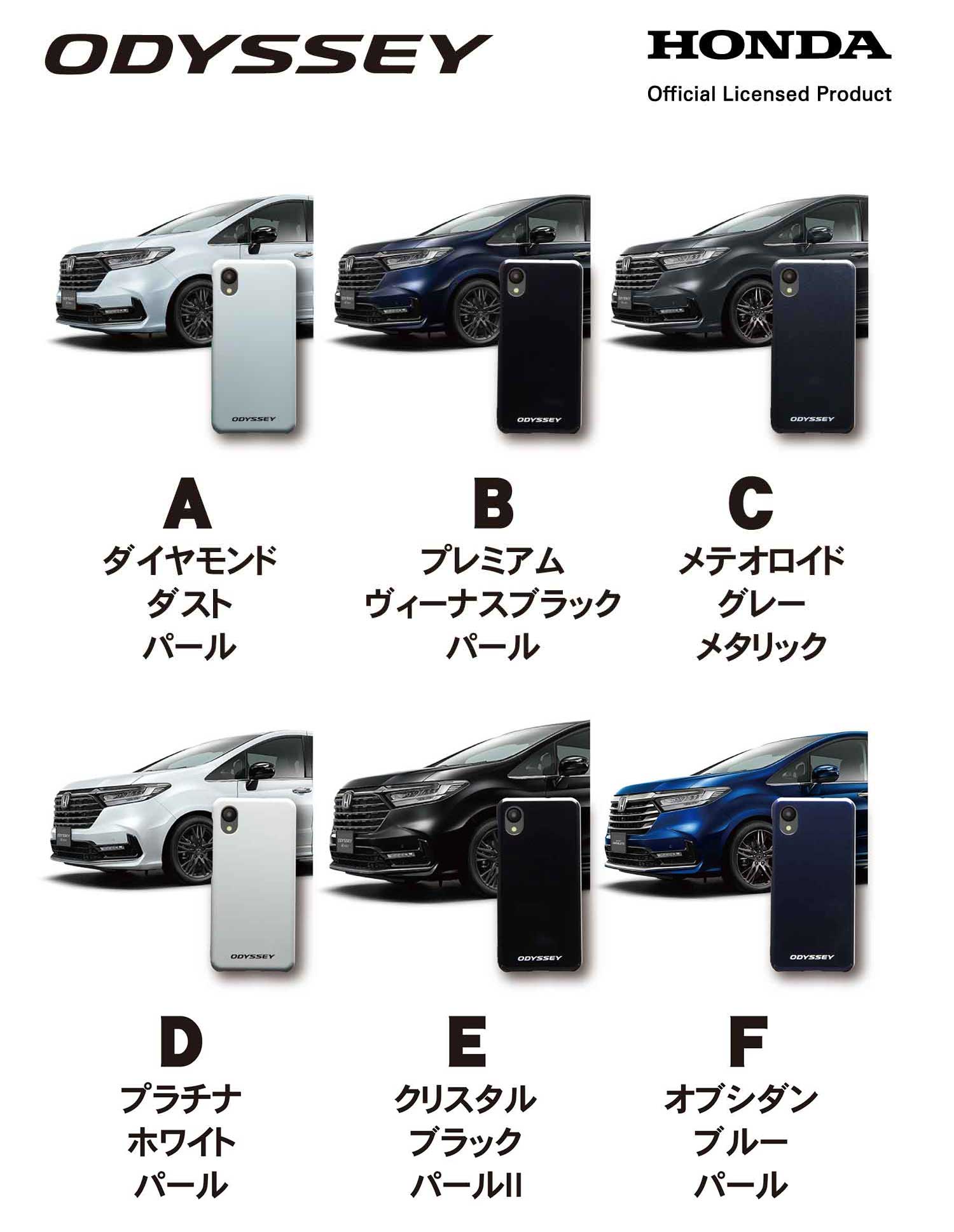 | ODYSSEY : 色を選択してください | A : ダイヤモンドダスト・パール(NH909P), B : プレミアムヴィーナスブラック・パール(NH820P), C : メテオロイドグレー・メタリック(NH904M), D : プラチナホワイト・パール(NH883P), E : クリスタルブラック・パールⅡ(NH945P), F : オブシダンブルー・パール(B588P) |
